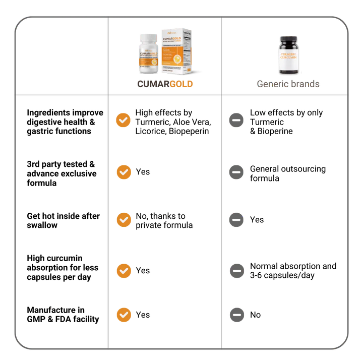 CUMARGOLD - Turmeric Curcumin, Black Pepper, Licorice For Digestive Support is compared to other generic brands in terms of unique advantages that help our product stand out the effectiveness